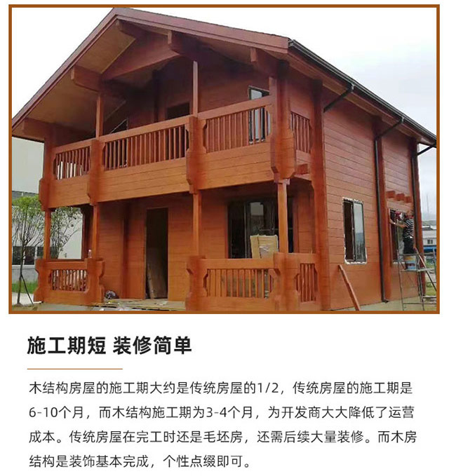 • 木結構房屋的施工期大約是傳統房屋的1/2,傳統房屋的施工期是 6-10個月,而木結構施工期為3-4個月,為開發商大大降低了運營 成本。傳統房屋在完工時還是毛坯房,還需后續大量裝修。而木房 結構是裝飾基本完成,個性點綴即可。